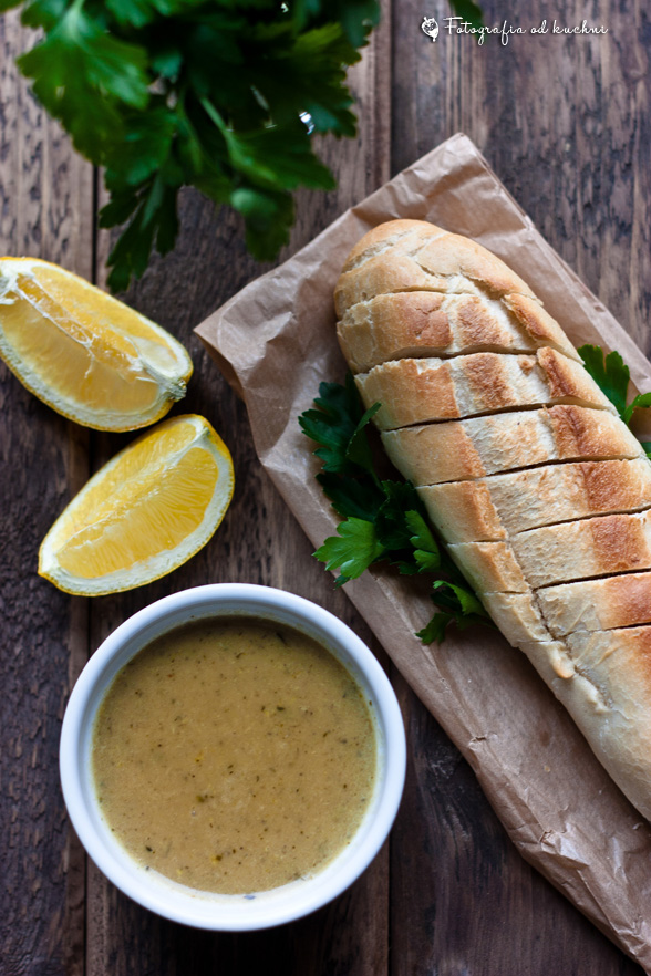 - Czosnek podziel na ząbki. Rozgrzej piekarnik do 180 stopni. 25 nie obranych ząbków czosnku umieść w naczyniu żaroodpornym, skrop 2 łyżkami oliwy oraz posyp solą i pieprzem. Wymieszaj całość, tak aby czosnek był pokryty oliwą. Naczynie przykryj folią aluminiową i wstaw do piekarnika. Piecz 30 minut, aż czosnek będzie miękki. Wyjmij czosnek z piekarnika i poczekaj aż ostygnie, następnie obierz go z łupinek (będą odchodzić łatwo) i umieść w miseczce.