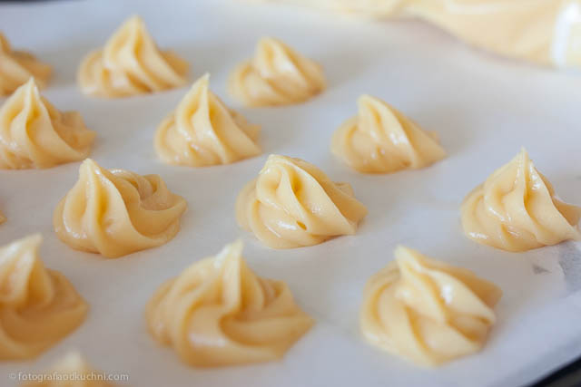 - Ciasto nakładamy do rękawa cukierniczego z końcówka okrągłą lub w kształcie gwiazdki i wypełniamy narysowane wcześniej okręgi.
