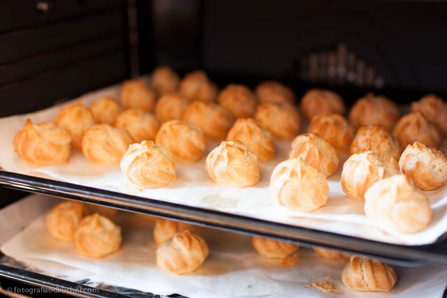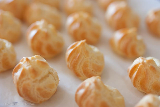 - Pieczemy około 20 minut, następnie obniżamy temperaturę do 150 stopni i pieczemy kolejne 20 minut, aż ptysie będą z wierzchu rumiane. Nie otwieramy piekarnika w czasie pieczenia! Studzimy na kratce, przekrawamy po zupełnym ostudzeniu. Alternatywnie można nie przekrawać ptysi, ale nadziewać szprycą od spodu.